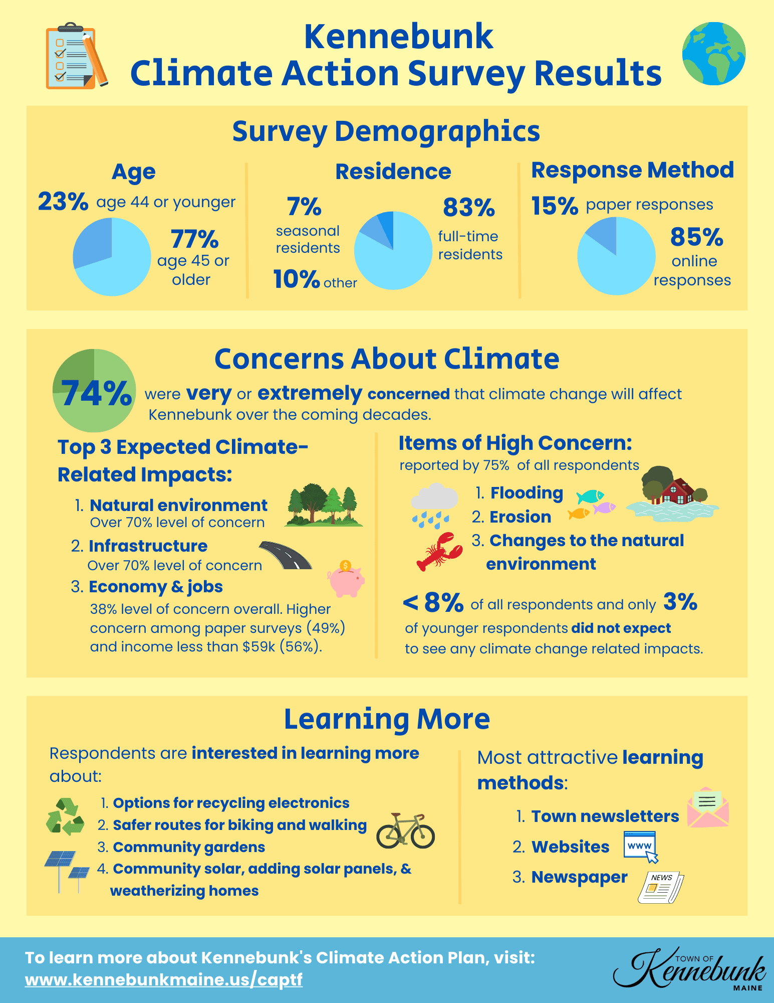 In August of 2022, the Town created a Climate Action Plan Task Force as part of a four-community cohort (Biddeford, Kennebunk, Kennebunkport & Kittery) to work with Southern Maine Planning and Development Commission on the creation of a Climate Action Plan (CAP). The Task Force met bimonthly since August of 2022, and as part of the development of the Climate Action Plan, conducted extensive community outreach through Climate Action Survey (PDF), commissioned a Vulnerability Assessment (PDF) and utilized a Greenhouse Gas Inventory as tools in the development of the Climate Action Plan.